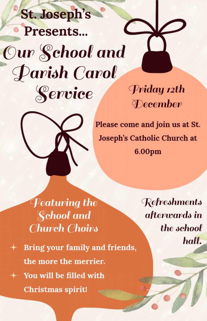 Please join us in this years Parish and School Christmas Carol Service. It will be a wonderful evening that will guarantee to get you in the Christmas spirit.